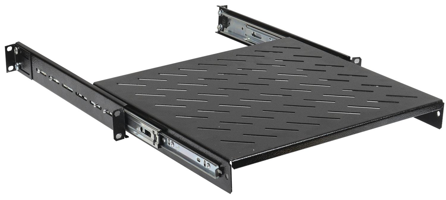 Выдвижные полки крепятся на фронтальные и на задние профили, имеют перфорированную поверхность для обеспечения лучшего охлаждения и отведения теплых воздушных потоков, а за счёт наличия специальных телескопических салазок способны плавно выдвигаться вперед за пределы рабочей плоскости, образованной передней парой 19'' профилей. Данные полки рассчитаны на оборудование, требующее регулярного обслуживания и извлечения из шкафа, но с небольшой общей массой, чтобы избежать его опрокидывание и возможной поломки выдвижного механизма полки.