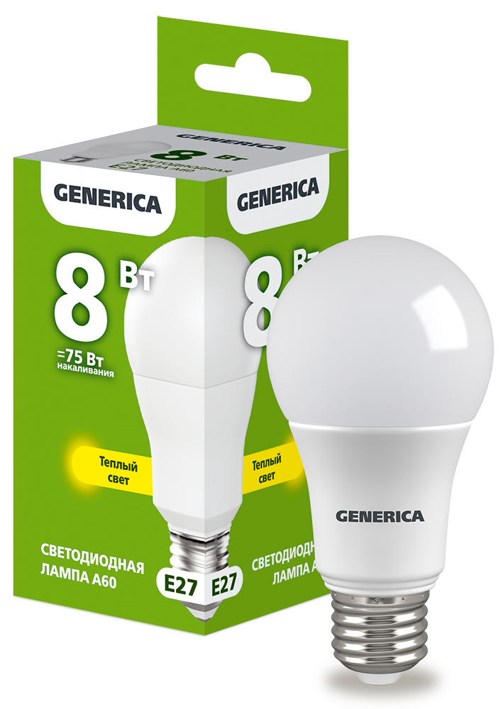 Лампа LED A60 груша 8Вт 230В 3000К E27 GENERICA