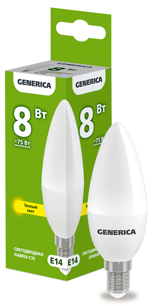 Лампа LED C35 свеча 8Вт 230В 3000К E14 GENERICA