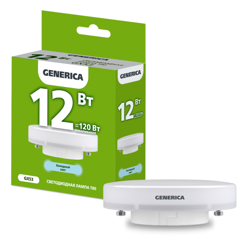 Лампа LED T80 таблетка 12Вт 230В 6500К GX53 GENERICA